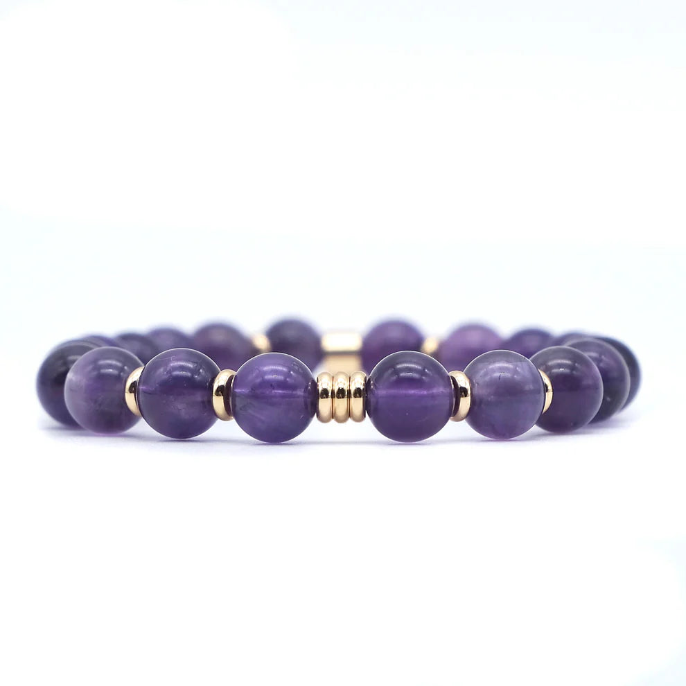 BRACELET ANTI-STRESS AMETHYSTE Catégorie AA / Perle plaquée OR 18 CARATS 8MM